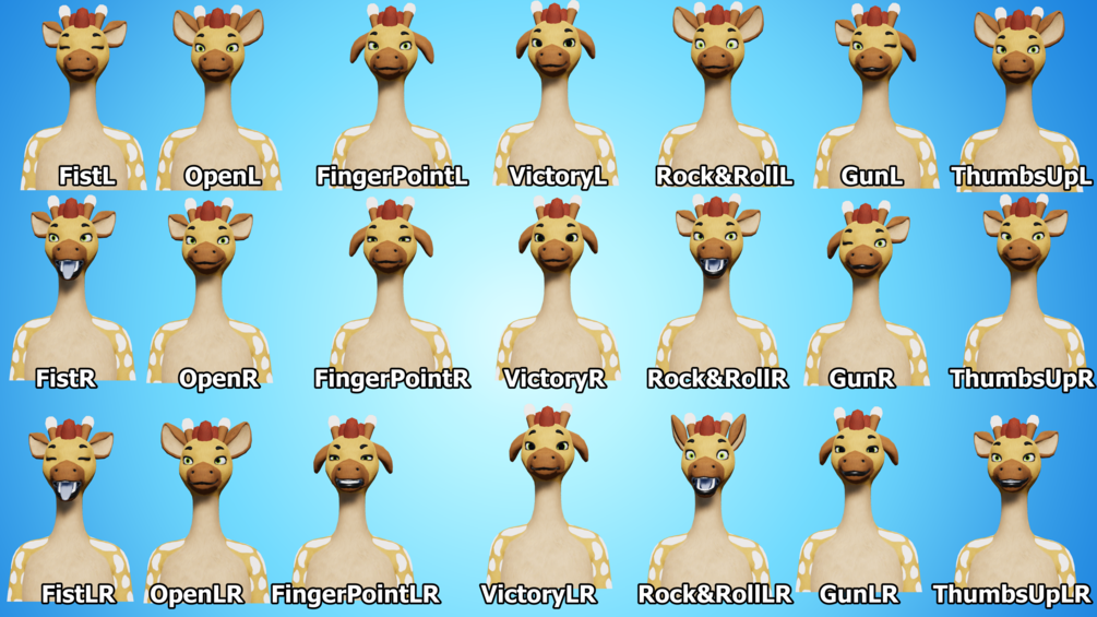 - Expression Float (Top-Happy, Top Right - Eyebrow up, Right - Fear, Right Down - WinkR, Down - Sad, Left Down - WinkL, Left - Squint, Top Left - Closed Eyes)