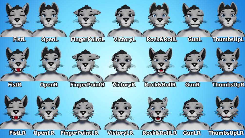 - Expression Float (Top-Happy, Top Right - Eyebrow up, Right - Fear, RightDown - WinkR, Down - Sad, Left Down - WinkL, Left - Squint, Top Left - Closed Eyes)