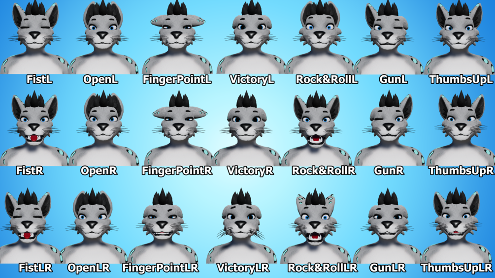 - Expression Float (Top-Happy, Top Right - Eyebrow up, Right - Fear, RightDown - WinkR, Down - Sad, Left Down - WinkL, Left - Squint, Top Left - Closed Eyes)