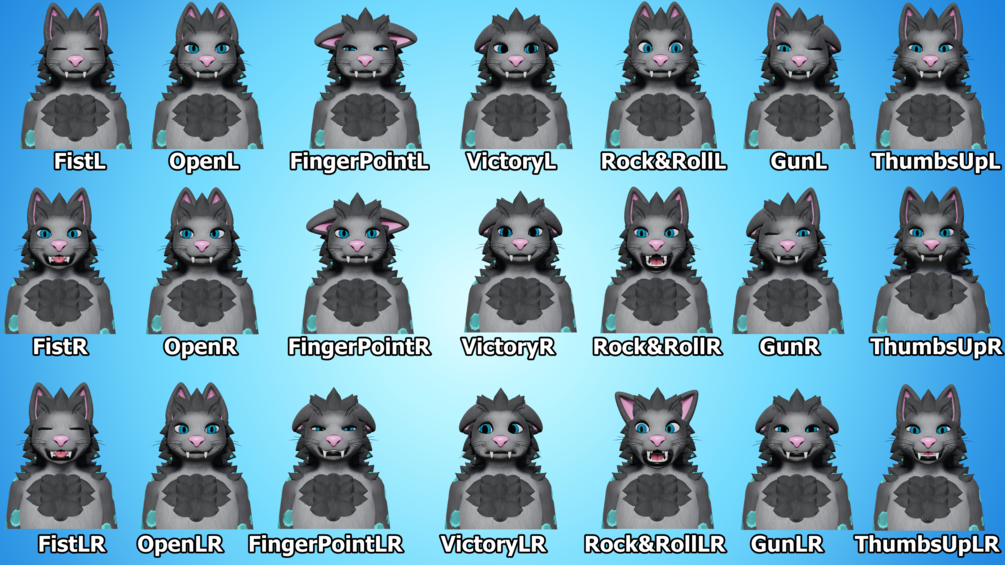 • Expression Menu Toggles - Happy, Sad, WinkL, WinkR, Squint, ClosedEyes, Fear, and Blep